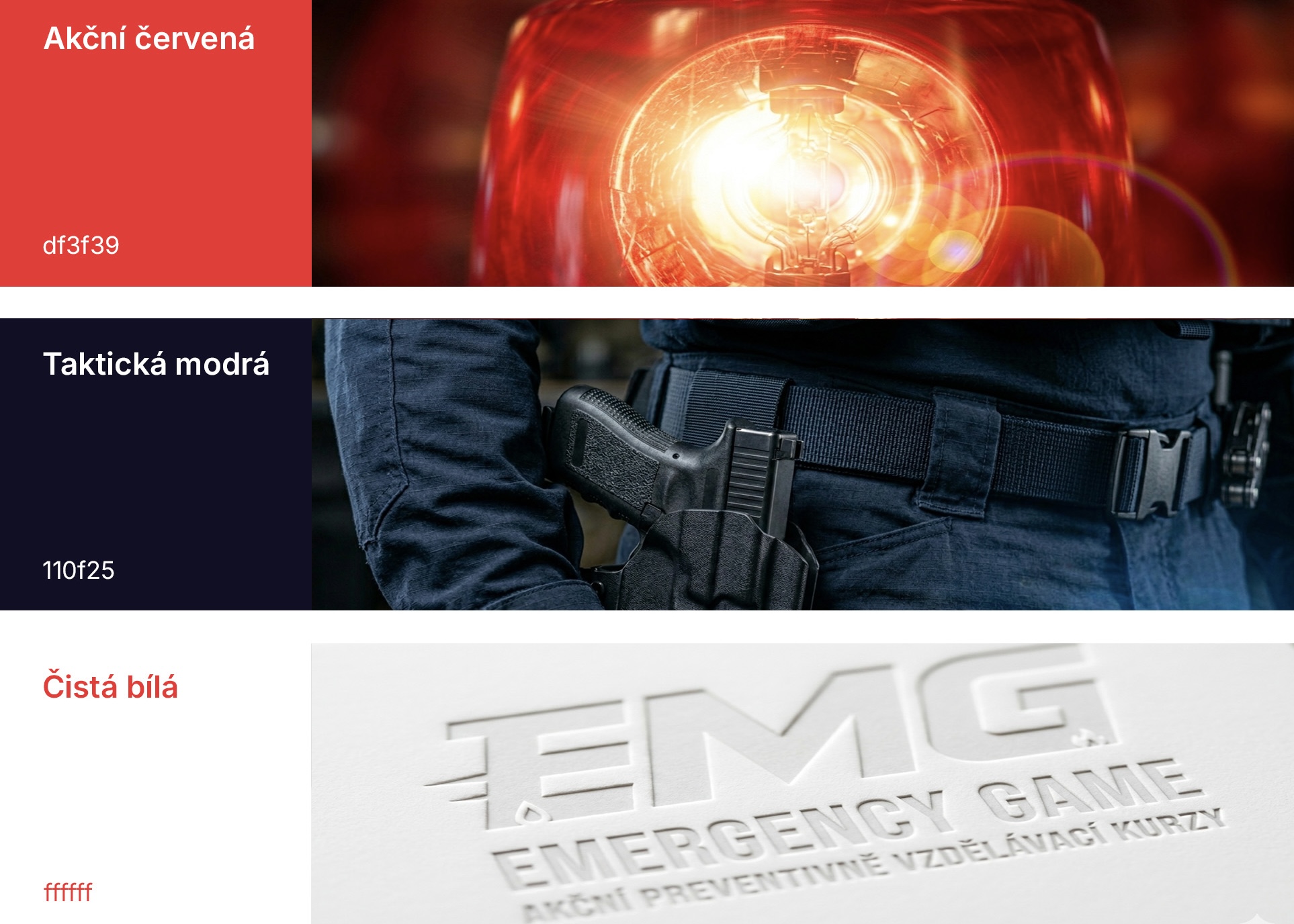 Pro projekt Emergency Game jsem vytvořila rebranding a komplexní vizuální identitu, která v sobě kombinuje adrenalin, strategii a přehlednost. Základem je dynamická barevná paleta: akční červená pro vyjádření urgence a energie, čistá bílá pro nezbytný vizuální odstup a taktická modrá, která vnáší do celého konceptu prvek profesionality a rozvahy. Typografii dominuje dominantní font Bebas Neue pro nekompromisní nadpisy s vysokým dopadem, které doplňuje maximálně čitelný font Inter pro veškerou textovou komunikaci.